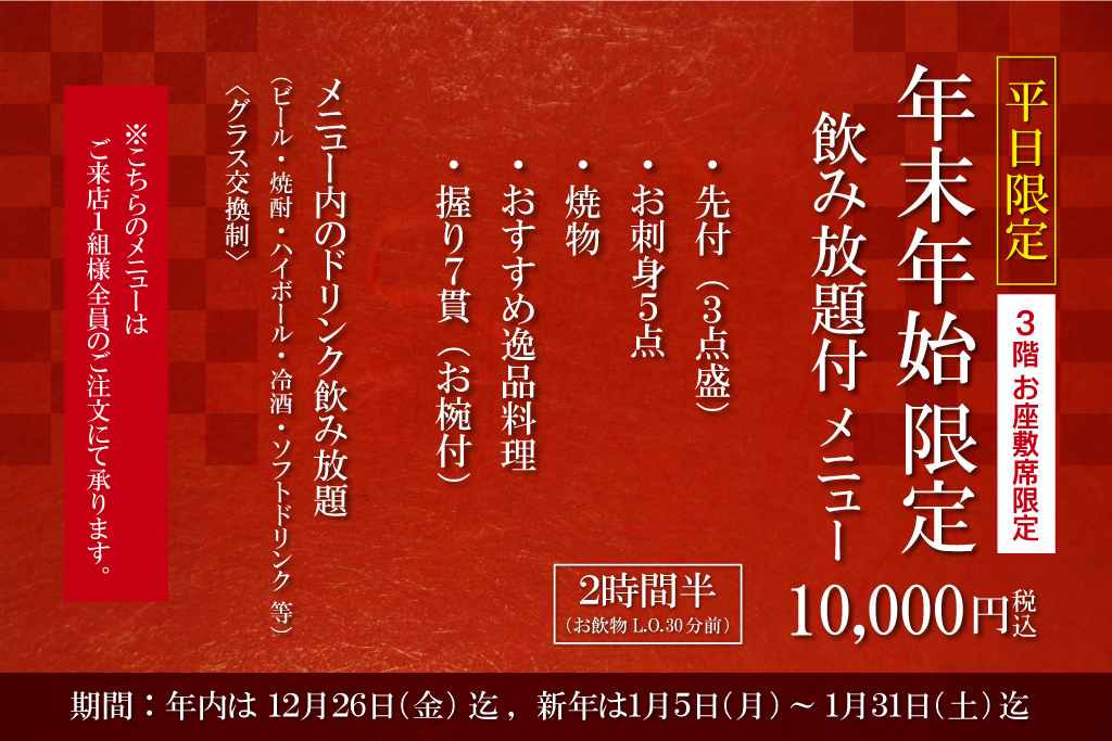 年末年始〈平日〉限定の飲み放題付きメニューです。